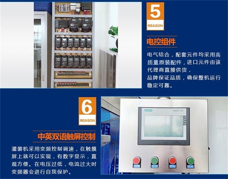 7.其他廠家采用調(diào)速電機(jī),靠手動(dòng)旋轉(zhuǎn)電機(jī)上的轉(zhuǎn)輪來(lái)改變輸送帶的速度,調(diào)整只能憑感覺(jué)極為不方便。我們的灌裝機(jī)采用變頻控制調(diào)速,在觸摸屏上就可以實(shí)現(xiàn),有數(shù)字顯示,直觀方便。在電壓過(guò)低,電流過(guò)大時(shí)變頻器會(huì)進(jìn)行自我保護(hù)。