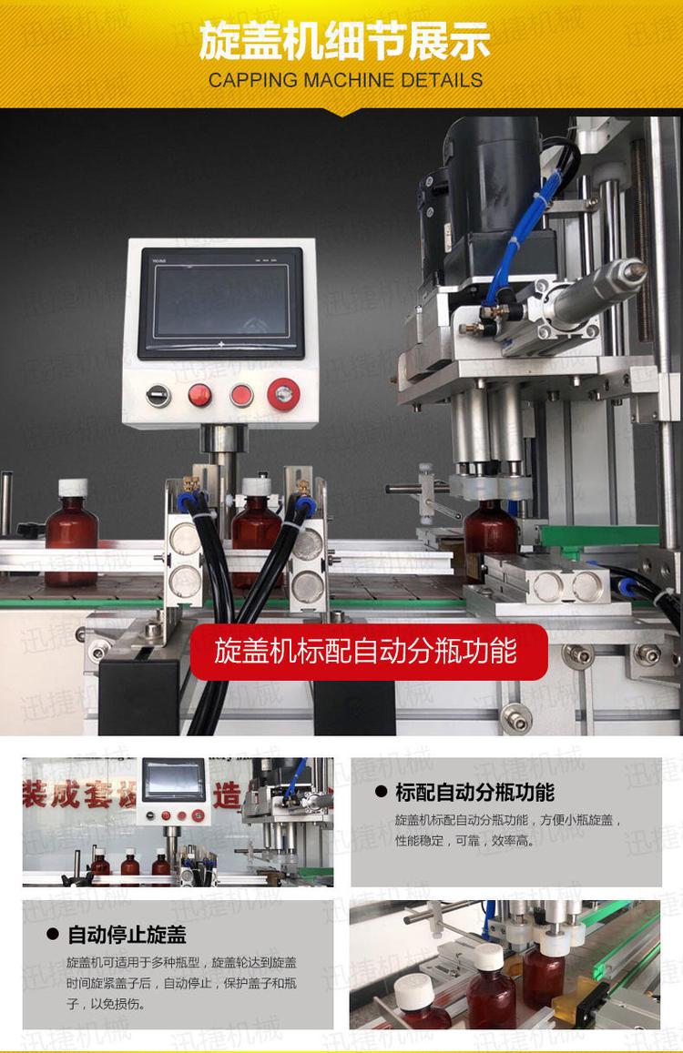 4、塑料瓶消毒水灌裝機  小玻璃瓶溶液灌裝機的旋蓋機部分可適用于多種瓶型,旋蓋輪達到旋蓋時間旋緊蓋子后,自動停止,保護蓋子和瓶子,以免損傷。