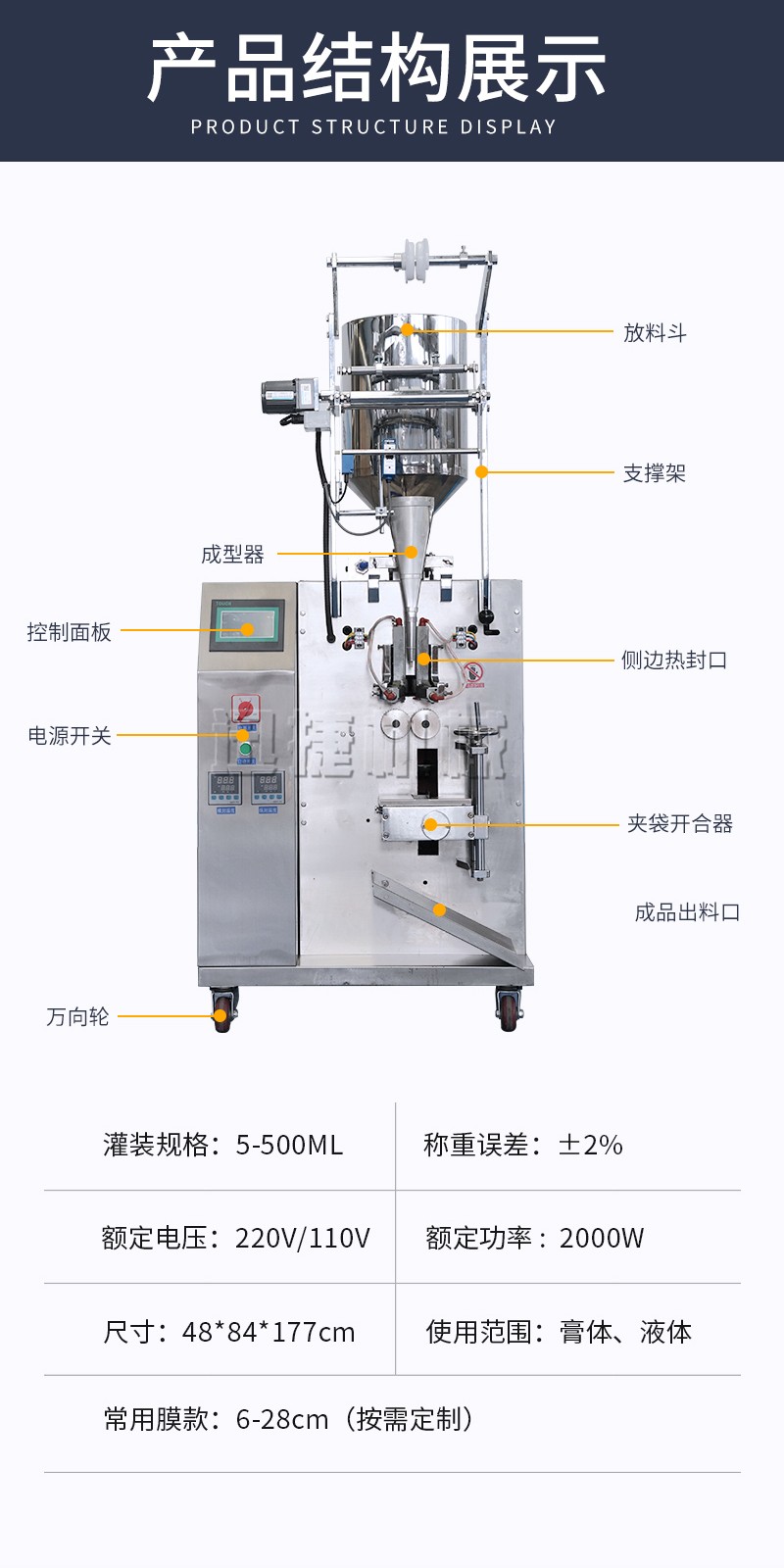 光電跟蹤及無極調(diào)速于一體,可周期完成下料、計(jì)量、日期打印、制袋、充填、封合、熱壓批號(hào)、分切計(jì)數(shù)等作業(yè)。